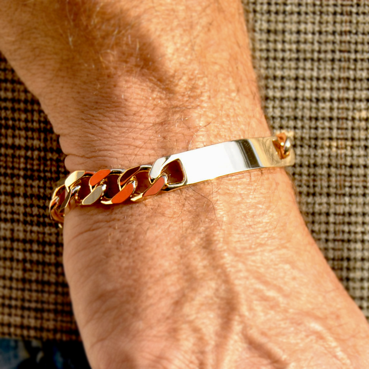 Gourmette homme en plaqué or à graver. Maille alternée 1+3. Largeur de 10mm. Fabrication 100% française. Gravure laser recto personnalisée offerte. Bracelet homme plaqué or modèle gourmette à personnaliser.